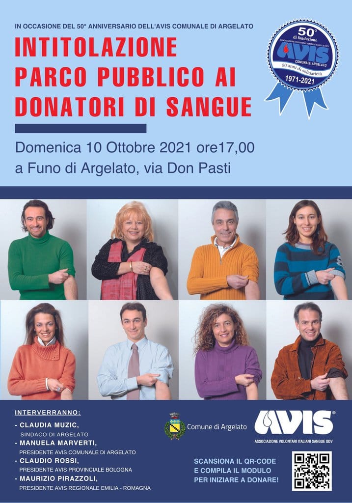In occasione del 50° anniversario dell’Avis Comunale di Argelato, domenica 10 ottobre alle ore 17,00 verrà intitolato ai donatori di sangue il parco pubblico a Funo di Argelato in via Don Pasti.
