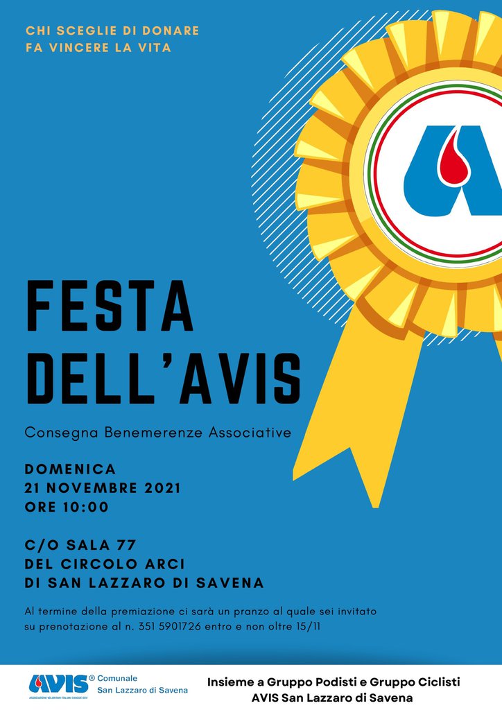 L’Avis Comunale di San Lazzaro di Savena (insieme a Gruppo Podisti e Gruppo Ciclisti Avis San Lazzaro) invita tutti i suoi soci alla Festa dell’ Avis in programma per domenica 21 Novembre 2021.