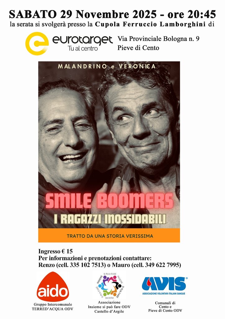 AVIS, AIDO e l’Associazione “Insieme si può fare” invitano tutti i soci Avis ad assistere allo spettacolo teatrale “Smile Boomers. I ragazzi inossidabili” Sabato 29 Novembre ore 20:45 presso la Cupola Ferruccio Lamborghini di Pieve di Cento.